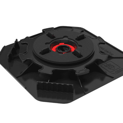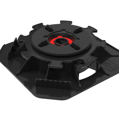 L’accessoire cale amortisseur est directement intégré sur la tête de plot et grâce à la bague de serrage rouge, la tête devient autonivelante ou reste fixe.